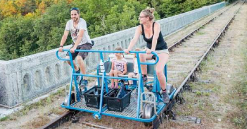 En 1817, el alemán Karl Drais ideó el precursor de la bicicleta. Con el tiempo, su invento se adaptó a las vías como pequeñas draisinas para recorrer raíles sin locomotora. Hoy, en el valle de la Molignée, aquellas antiguas vías que transportaban piedra y los productos de la Abadía de Maredsous vuelven a la vida: las draisinas se pedalean entre bosques y ríos, convirtiendo la historia en una divertida aventura sobre raíles.